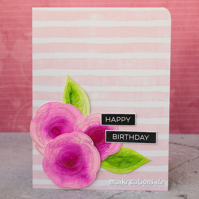Ich habe Peacock Feathers Distress Ink auf ein weißes Stück Papier aufgewischt, die Farbe dabei nach oben links hin verblassen lassen und habe anschließend einige dicke Tropfen Wasser darauf tropfen lassen. Nach circa einer halben Minute habe ich die Restfeuchtigkeit mit einem Tuch aufgenommen und ein Rechteck aus dem Papier gestanzt. Diesen fast-Bokeh-Effekt finde ich wirklich klasse - der Hintergrund bekommt dadurch wirklich noch viel mehr Tiefe ;o)